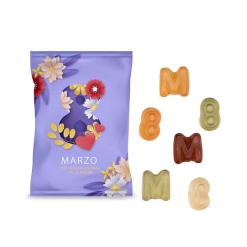 En Dolce BCN queremos facilitar una forma original y sabrosa de mostrar apoyo al Día Internacional de la Mujer (8 de marzo). Nuestra bolsa de 20 g con caramelos de goma con forma de «8» y «M» representa visualmente el símbolo de la jornada, convirtiéndose en un detalle significativo que comunica compromiso y empoderamiento femenino de manera dulce.