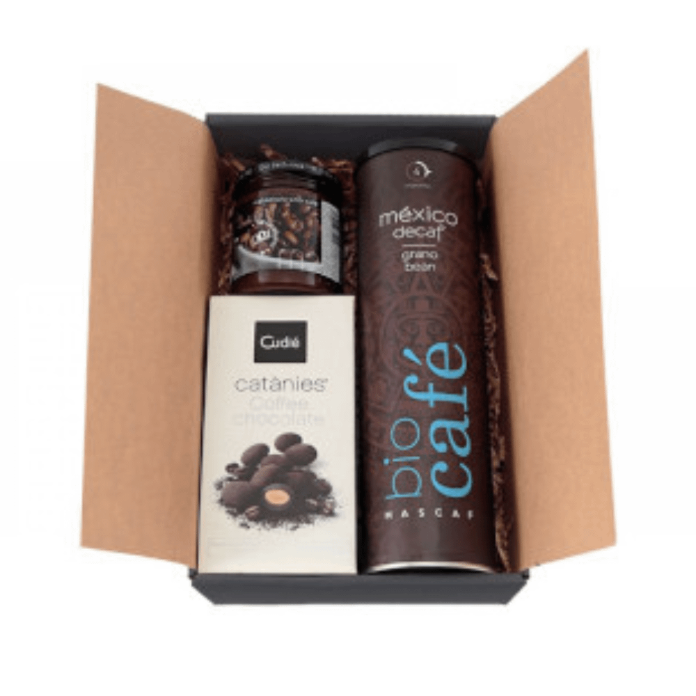 Contiene: tubo 250 g café gourmet en grano, estuche 80 g catanias de café, mermelada de café 250 g.