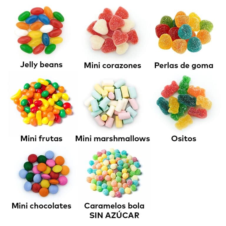 Contenido: A elegir entre jelly beans, perlas de goma, mini-marshmallows, mini corazones de goma, mini frutas (consultar otras opciones)