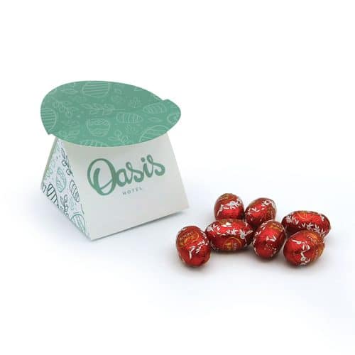 En su interior, incluye una exquisita selección de mini huevos de chocolate Lindt y/o mini conejitos de Pascua, aportando un toque gourmet que refuerza la percepción de calidad de tu marca.