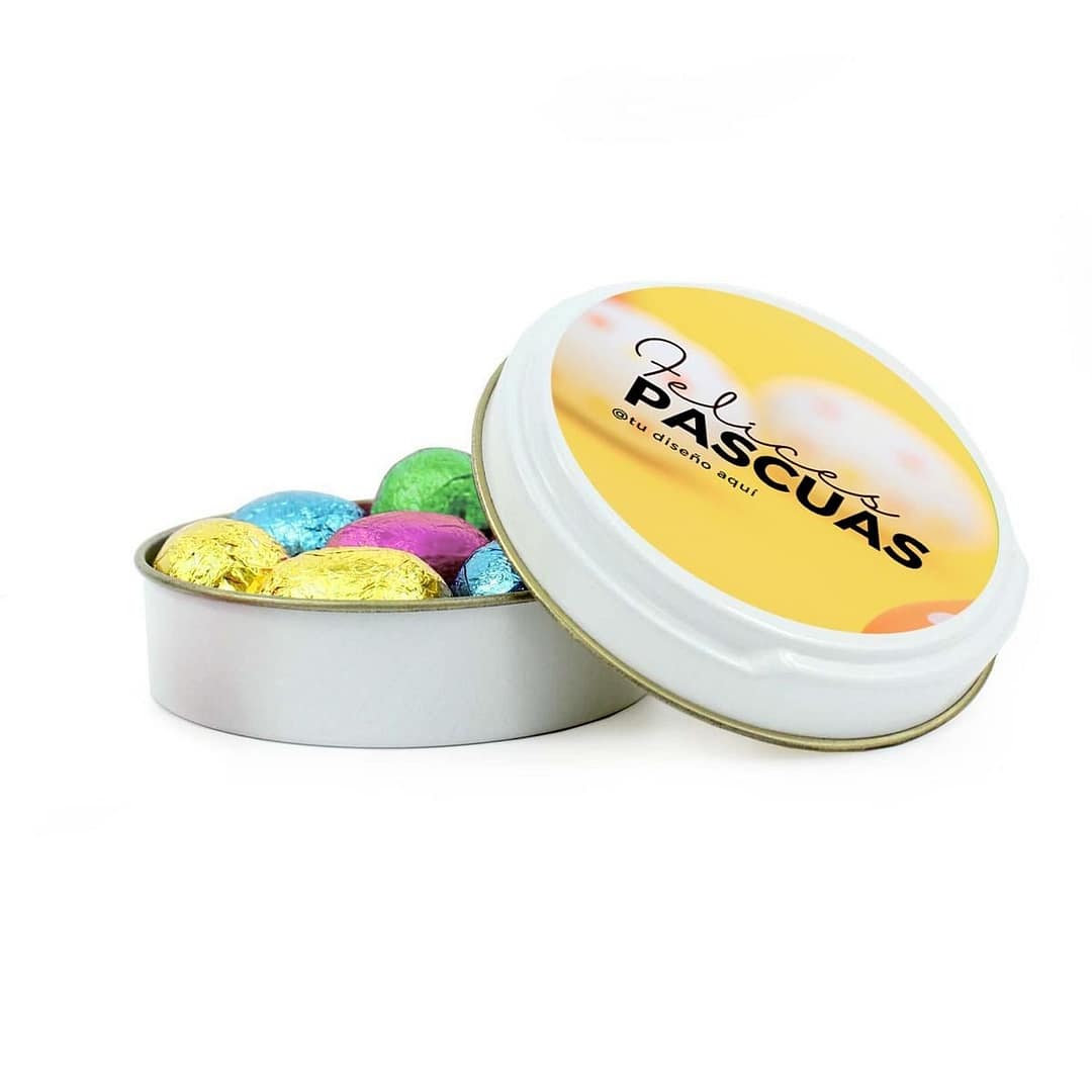 Haz que tu marca destaque esta Pascua con una lata metálica personalizada, rellena con deliciosos mini huevos de chocolate. Su diseño compacto y elegante, junto con la impresión digital a todo color en la tapa, convierten este producto en un detalle promocional perfecto para Pascua.