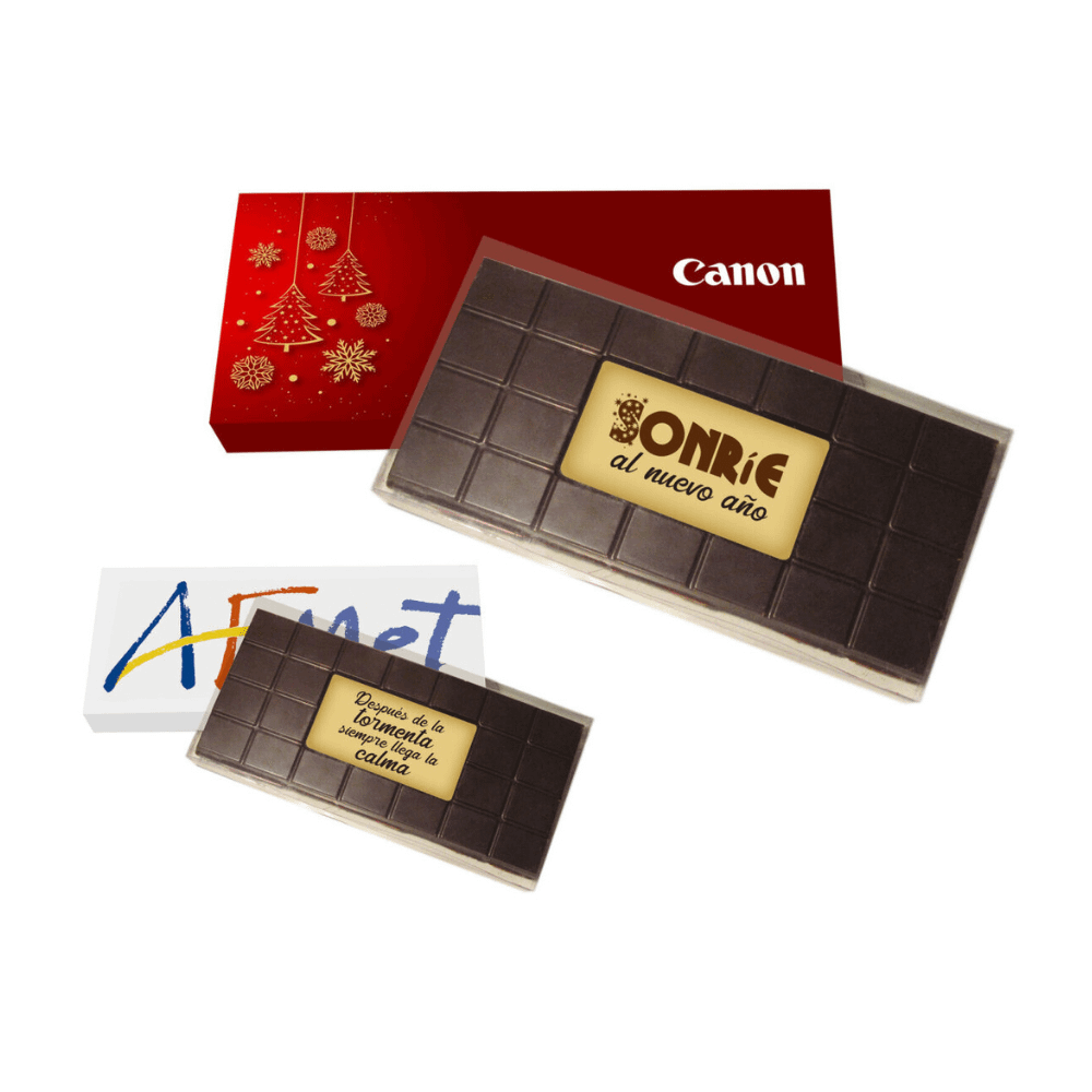 Tableta de chocolate con leche o negro y chocolate blanco con mensaje personalizado en serigrafia.