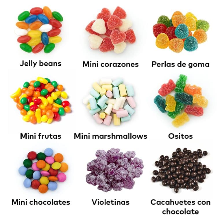Contenido: Jelly beans, Perlas de goma, mini – frutas, mini – corazones, ositos, mini chocolates, cacahuetes de chocolateā¦