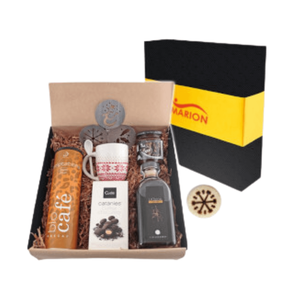 Contiene: fresca de licor de café de 500 ml, tubo 250 g. café gourmet en grano, estuche 80 g. catanias sabor café, crema castaña con chocolate, taza cerámica con cuchara, plantillas metalicas para dibujos en café.