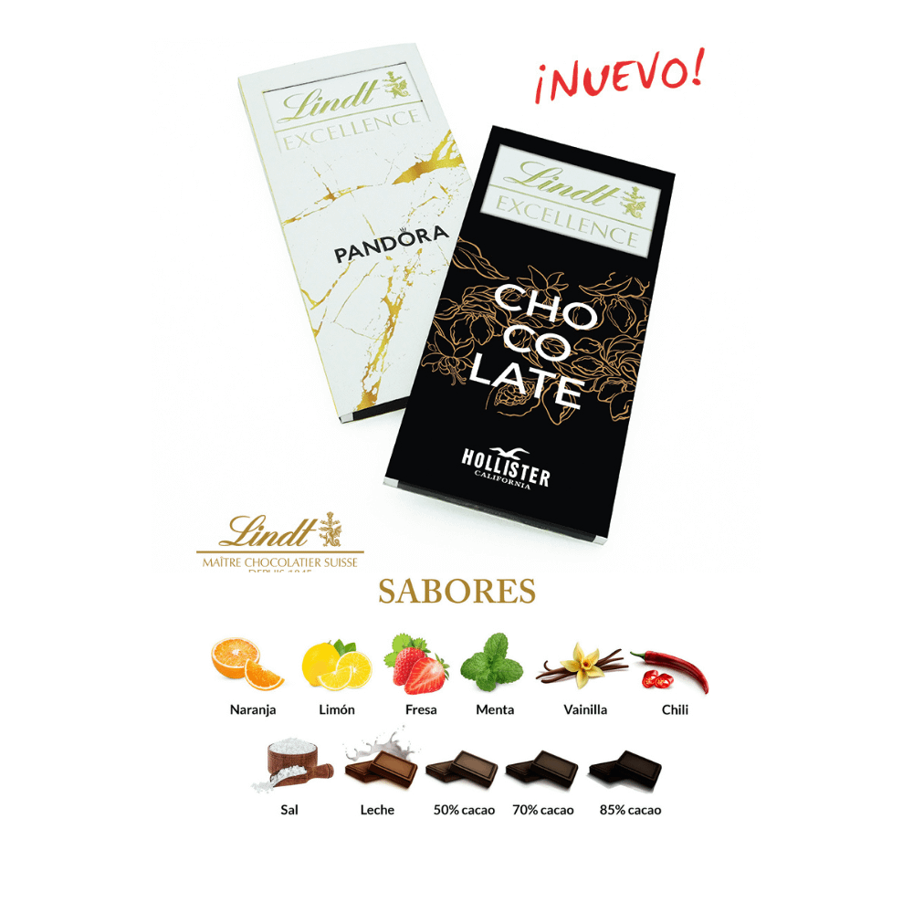Sabores: naranja, limón, fresa, menta, vainilla, chili, sal, leche, 50 % cacao, 70% cacao o 85 % cacao.