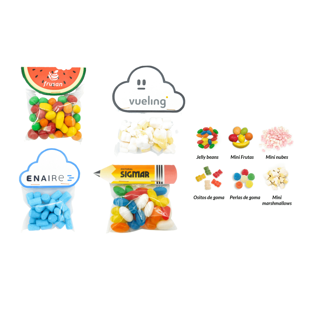 Relleno: jelly beans, mini frutas, mini nubes, ositos, perlas de goma o mini marshmallows.